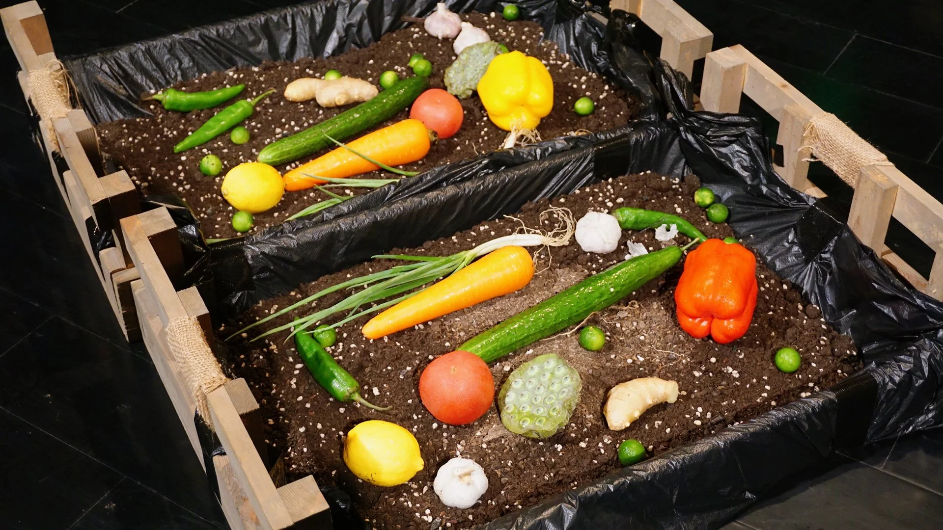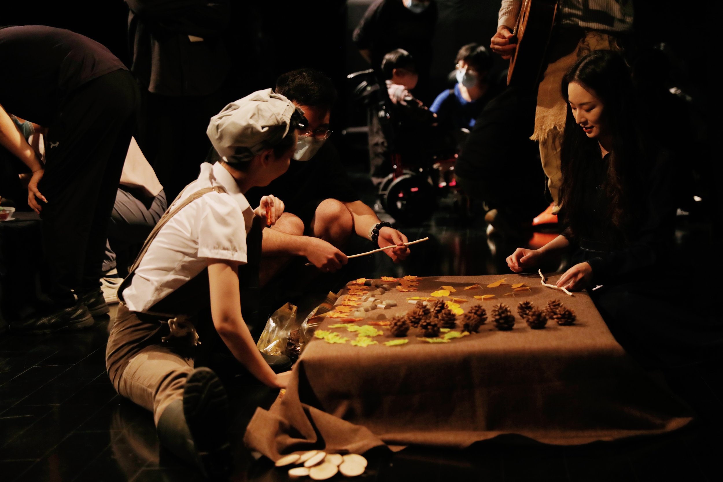 Set within a farm-themed environment filled with natural materials, children and their families were invited to engage in free exploration — digging through colourful and aromatic fruits and vegetables, feeling the flow of water and sand through their fingertips, creating unique artworks using fallen leaves and twigs, and listening to the enchanting melodies played by different seeds.